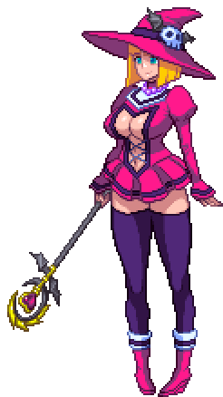 A pixel art witch or sorceress in a pink hat and revealing outfit, holding a magical staff with a crescent moon.