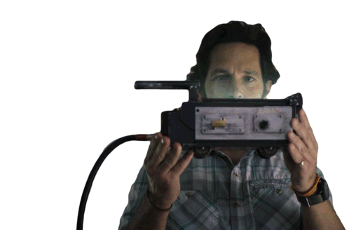 Paul Rudd as Mr. Grooberson reacts with surprise as green light emanates from a Ghost Trap he's holding.