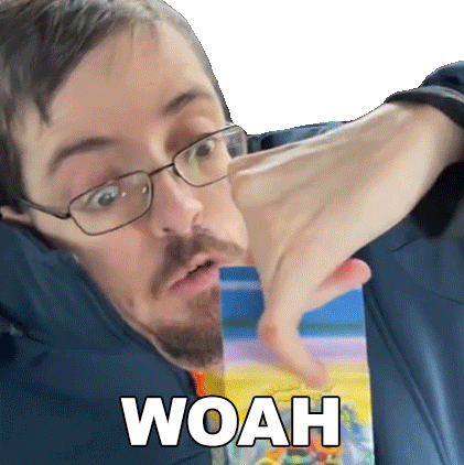 Ricky Berwick reacts with a surprised expression, looking at a colorful package with the word 'WOAH' displayed.
