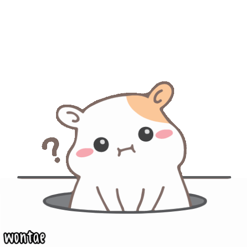 A cute Wontae hamster peeks from a hole, looking confused with question marks floating around its head.