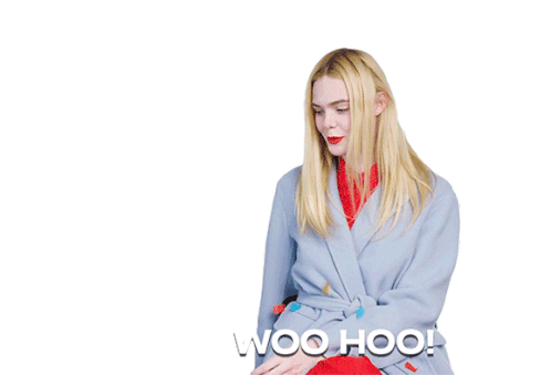 Elle Fanning expresses excitement with a cheerful "Woo Hoo!" gesture, smiling and raising her hands in celebration.