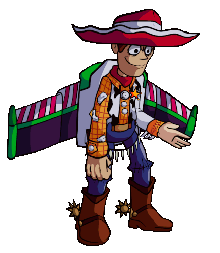 Woody from Toy Story, part of The Unmasked Toys, appears with Buzz Lightyear's wings and hat, looking surprised.