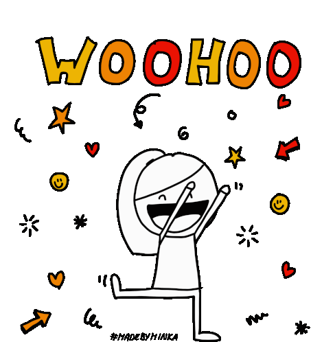A stick figure character by Madebyminka dances joyfully with 'WOOHOO' text and celebratory elements, perfect for expressing excitement.