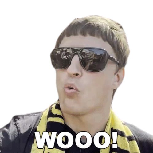 Danny Mullen, wearing sunglasses and a scarf, shouts 'Wooo!' with an excited and hyped expression.