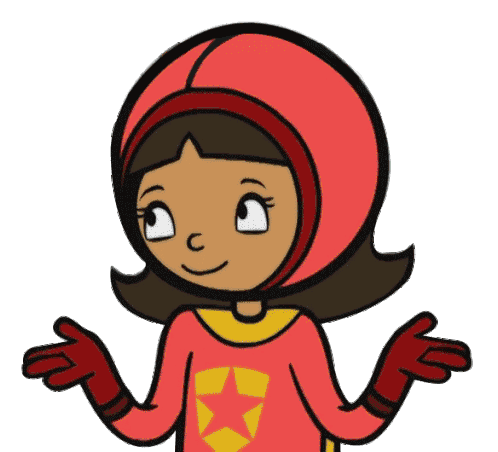 Becky Botsford, also known as Wordgirl, makes a smug shrugging gesture with a confident expression.