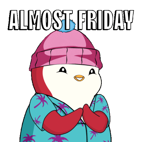 A cute animated penguin character in a beanie and Hawaiian shirt happily anticipating 'ALMOST FRIDAY'.