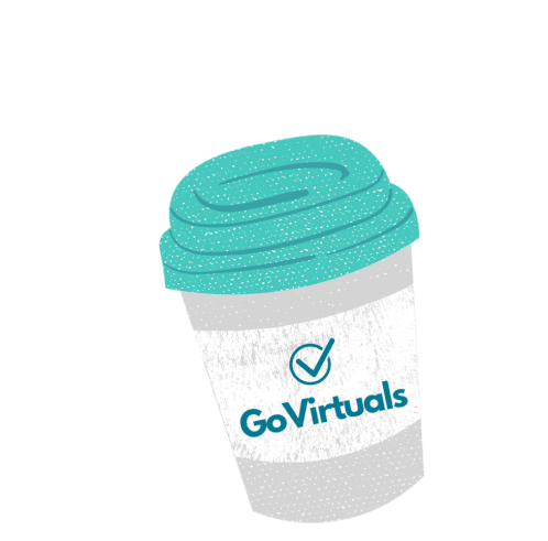 A vibrant GoVirtuals coffee cup with a teal lid, sparkling with yellow stars, perfect for work from home vibes.
