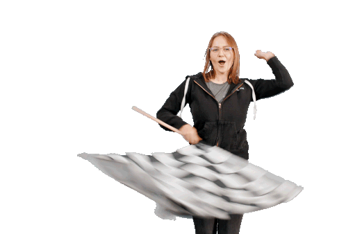 A young woman with glasses and a black hoodie enthusiastically waves a checkered flag, cheering with excitement and energy.