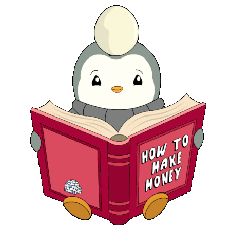 A cute Pudgy Penguin with an egg on its head reads a book titled 'How to Make Money,' then 'Work,' and starts crying.