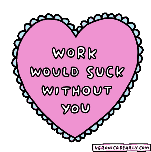 A vibrant pink heart animated sticker by Veronica Dearly, featuring the heartfelt message 'Work Would Suck Without You'.