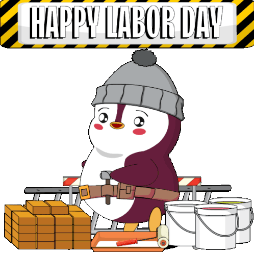 A cute penguin worker wearing a beanie and tool belt, holding a hammer, celebrates Happy Labor Day.