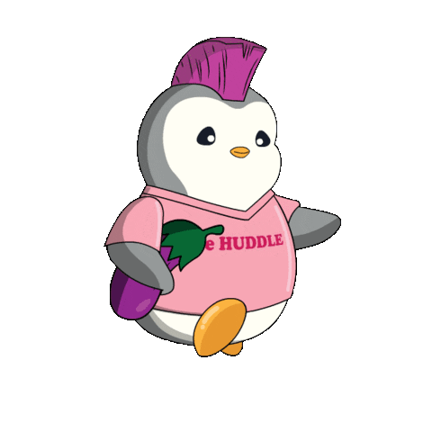 A cute pudgy penguin with a mohawk and pink shirt, holding an eggplant and doing a workout or running in place.