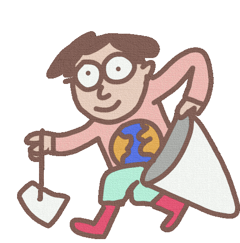Luis Ricardo, a cartoon character with glasses, actively cleans the world with a net, promoting eco-friendly action.