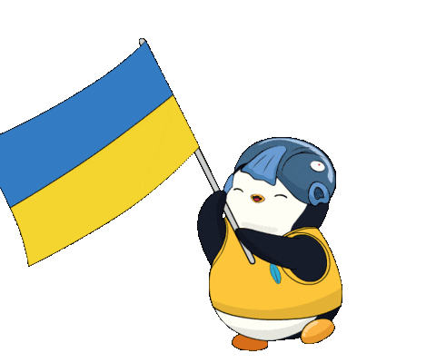 A cute Pudgy Penguin happily waves the blue and yellow Ukrainian flag, showing support and patriotism.