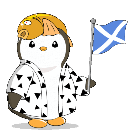 A cute Pudgy Penguin character, wearing a fish hat and kimono, proudly waves the blue and white Scottish flag.
