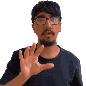 a man with glasses and a beard is making a stop sign with his hand