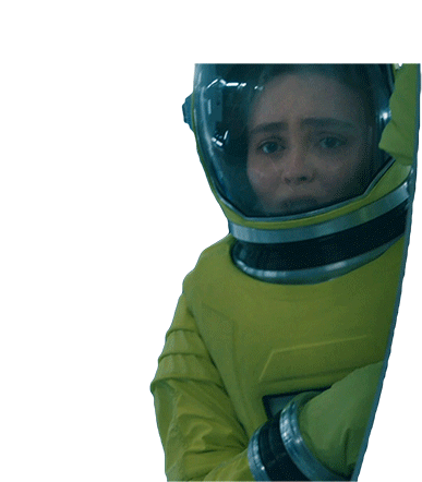 Sela, looking anxious and worried in a yellow hazmat suit, appears distressed and uncertain, as if contemplating a difficult situation.