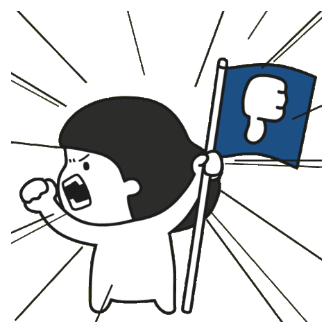 An angry cartoon character protests loudly, waving a blue flag with a white thumbs-down symbol, expressing strong dislike.