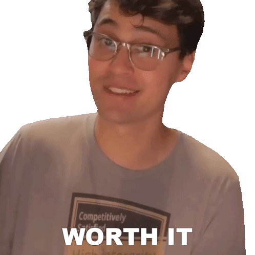 Hunter Engel enthusiastically declares "WORTH IT" with an open mouth and expressive face, wearing glasses and a grey t-shirt.