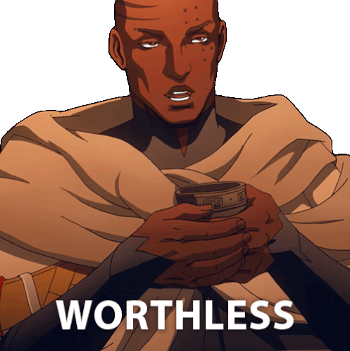 Isaac from Castlevania holds a cup, looking serious, with the word "Worthless" displayed on screen.