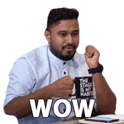 Abish Mathew reacts with an enthusiastic 'WOW', expressing amazement and impressiveness while holding a 'THE STAGE' mug.