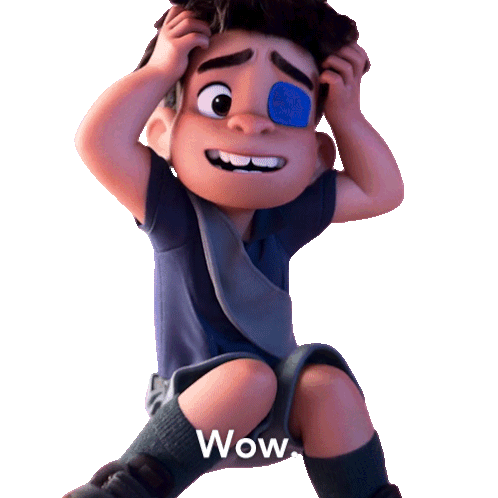 Elio Solís from Disney Pixar's 'Elio' reacts with wide eyes and hands on head, exclaiming 'Wow' in surprise.