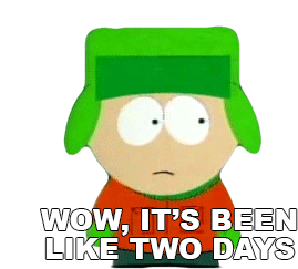 Kyle Broflovski from South Park sarcastically exclaims "Wow, It's Been Like Two Days" with an exasperated expression.