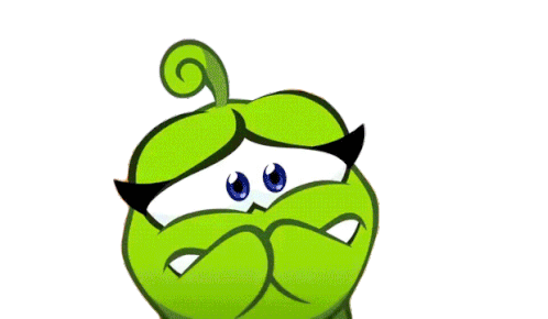 Om Nom from Cut the Rope transforms from a sad, worried expression to a wide, excited smile with sparkling eyes, showing amazement.