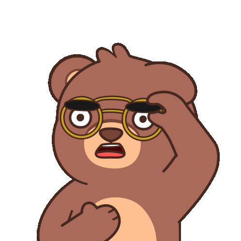 A cartoon bear wearing sunglasses looks shocked and surprised, pulling down its glasses to see better.