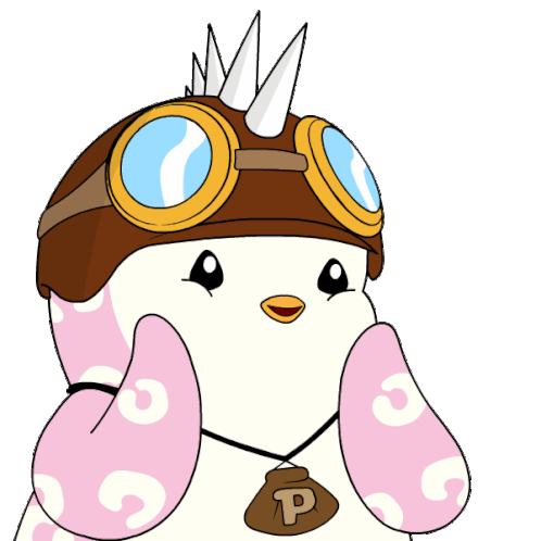 A cute cartoon Pudgy Penguin, wearing an aviator helmet and goggles, displays an amazed 'wow' expression with wide eyes and an open beak.