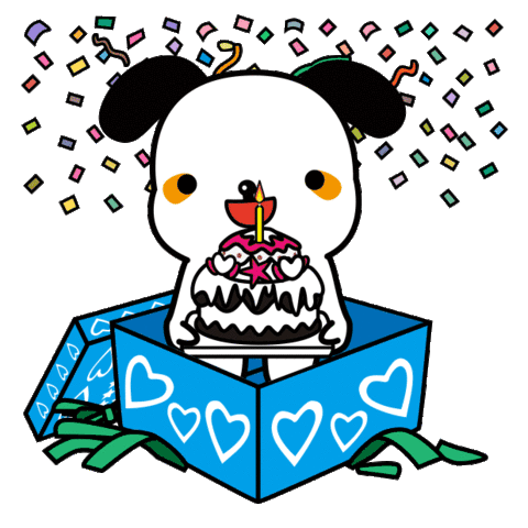 Pochacco pops out of a blue gift box with a birthday cake, surrounded by confetti, celebrating a special occasion.