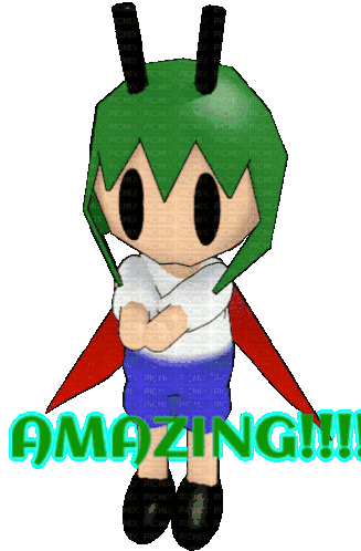 Wriggle Nightbug, the Touhou character, stands with red wings and green hair, exclaiming 'AMAZING!!!'