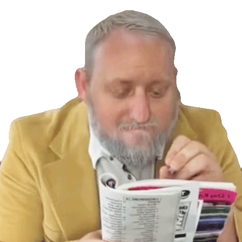 Dj Hunts intently reading a book or pamphlet, appearing to take notes or study the content.