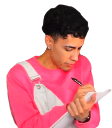 Giovanni Rivera, wearing a pink sweatshirt and white overalls, is diligently writing notes in a small notebook with a pen.