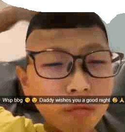 a young boy wearing glasses is taking a selfie with a snapchat message .