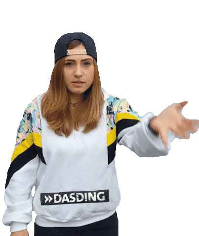 Saskia, wearing a Dasding sweatshirt, makes a 'talk to the hand' gesture with a serious expression, conveying a 'wtf' or 'stop' mood.