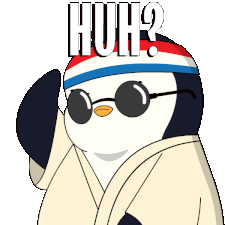 A confused Pudgy Penguin wearing sunglasses and a headband raises a flipper, asking 'HUH?' in a moment of bewilderment.