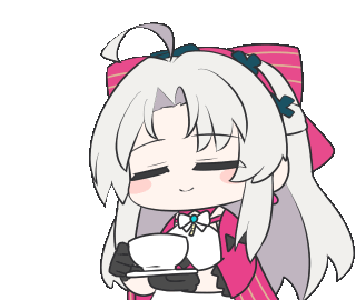 a drawing of a girl with white hair holding a cup with the words de su wa written on it