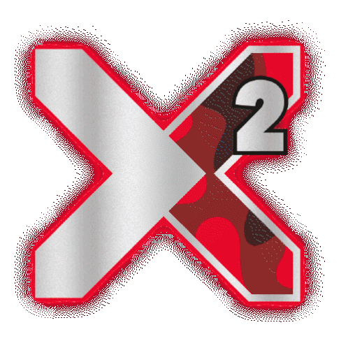 Animated X2 Biermix logo sticker, featuring a stylized 'X' with a '2' on a blue, liquid-patterned arm.
