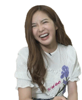 A young woman with long brown hair laughs heartily, head tilted back, mouth wide open in pure joy.