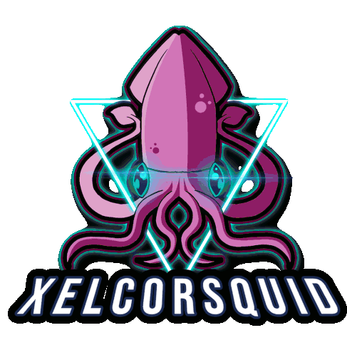 Animated sticker featuring Xelcorsquid's changing heads, showcasing two distinct looks with expressive faces and the brand name.
