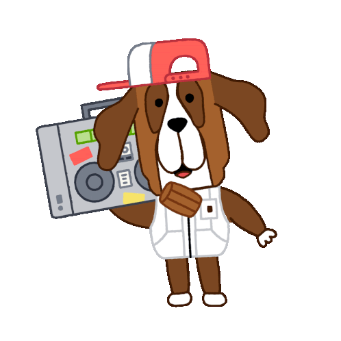 A cool St. Bernard dog wearing a cap and vest, holding a boombox, ready to play some music. Perfect for Xfactor fans.