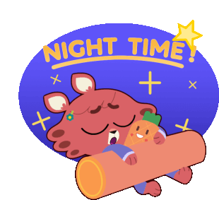 Paprika, the cute deer-like character, is sound asleep, hugging a log with a carrot plushie under a starry night sky.