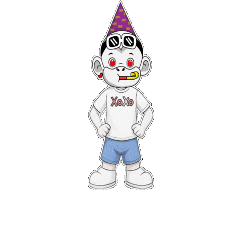 a cartoon monkey wearing a party hat and sunglasses with the word xoxo on his shirt