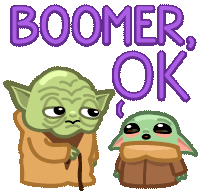 Baby Yoda and Yoda in a 'Boomer, OK' meme sticker. Yoda looks unimpressed while Baby Yoda looks sad.