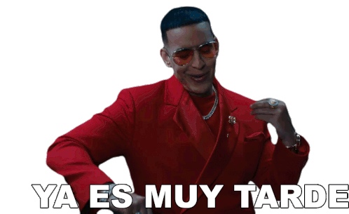 Daddy Yankee in a red suit, gesturing with the caption 'Ya Es Muy Tarde' (It's Too Late).
