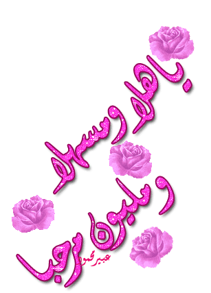 Glittering red Arabic text 'Welcome and a million welcomes' with sparkling roses on a white background, signed by Abeer Mahmoud.