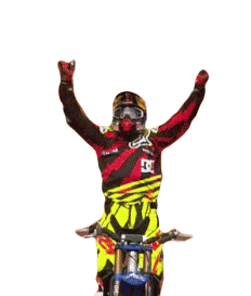 A motocross rider in full gear celebrates a victory, raising arms in triumph. Expresses excitement and joy.
