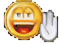 A classic Yahoo Messenger emoji with a wide grin and eyes, performing various expressive hand gestures like a middle finger, fist, and rock-on sign.