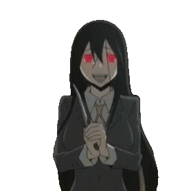 An intense Yandere anime girl with long black hair, glowing red eyes, and a chilling smile, holding a knife.